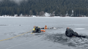 VIDEO/PHOTOS: It was a case of the right people being in the right place at the right time. On Tuesday, members of the King County Sheriff’s Office Marine Unit and Mercer Island Police were conducting water rescue training at Fish Lake in the Cascade Mountains when a man fell through the ice right in front of them.